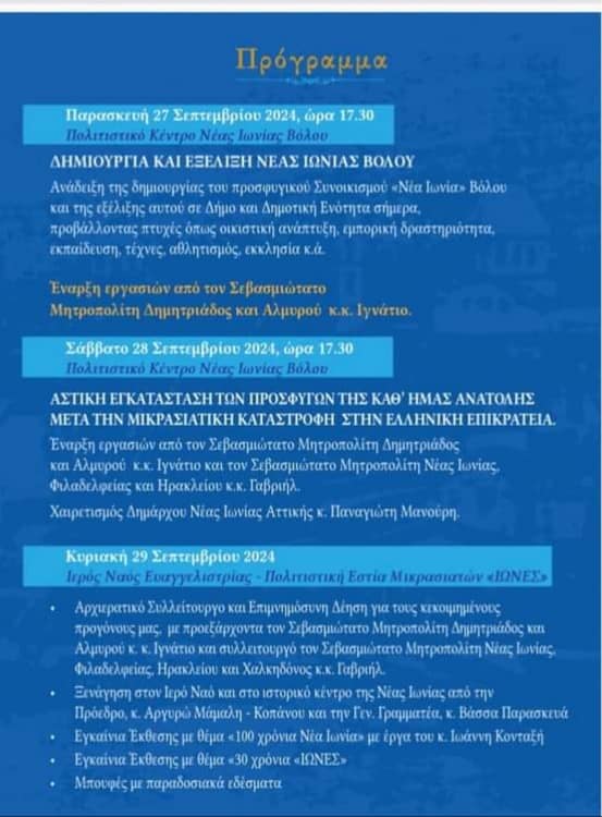 Την Κυριακή, 29 Σεπτεμβρίου το πρωί , στον Ι.Ν. Ευαγγελιστρίας τελέστηκε Αρχιερατικό Συλλείτουργο και Επιμνημόσυνη Δέηση για τους κεκοιμημένους προγόνους μας, με προεξάρχοντα τον Σεβασμιώτατο Μητροπολίτη Δημητριάδος και Αλμυρού κ. κ. Ιγνάτιο και συλλειτουργό τον Σεβασμιώτατο Μητροπολίτη Νέας Ιωνίας, Φιλαδελφείας ,Ηρακλείου και Χαλκηδόνος κ.κ. Γαβριήλ . Ακολούθησε ξενάγηση στον Ιερό Ναό και στο ιστορικό κέντρο της Νέας Ιωνίας από την Πρόεδρο των’’ ΙΩΝΩΝ’’ , κ.Αργυρώ Μάμαλη-Κοπάνου και την Γεν Γραμματέα ,κ. Βάσσα Παρασκευά. Ακολούθησε επίσκεψη στην στέγη της Εστίας ‘’ΙΩΝΕΣ’’, όπου πραγματοοποιήθηκε τελετή εγκαινίων της έκθεσης με θέμα ‘’100 χρόνια Νέα Ιωνία ‘’ καθώς και της έκθεσης ‘’30 χρόνια ΄΄ΙΩΝΕΣ΄΄.